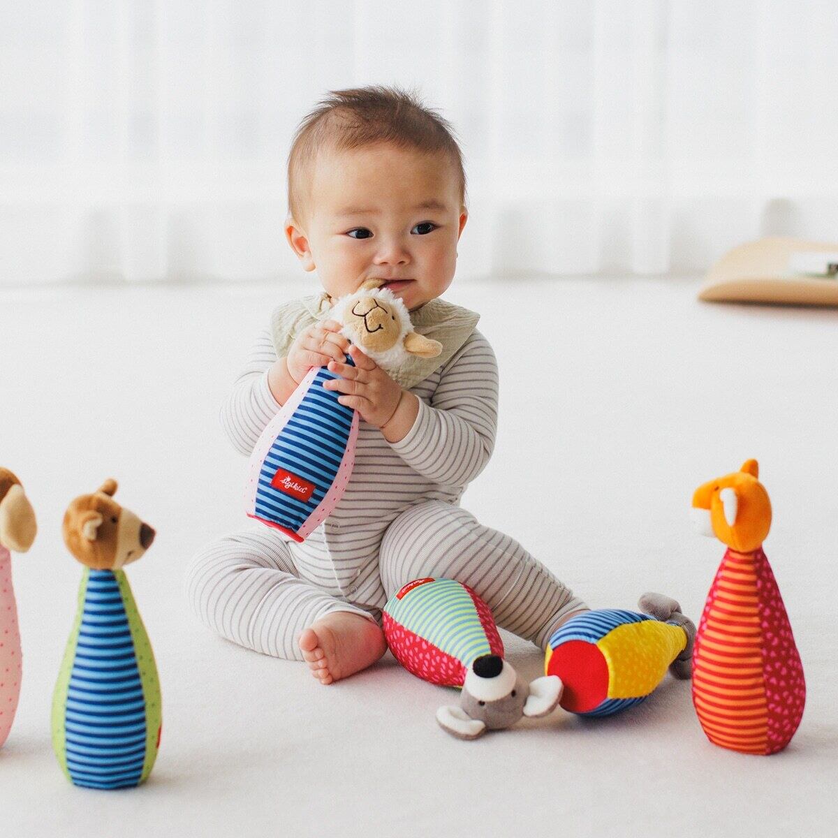 ぞう、ねずみ、ひつじ、ねこ、いぬ、くまの6種類のかわいい動物たちのピンをねらって、ボールを転がしてボウリング大会!お顔をみせて話しかけをしたり、お耳やおはなを触って、ぎゅっとにぎってあそんでみましょう。振るとビーズの音がするので、ラトルとしても楽しめます。少し大きくなったら、自分でピンを並べてボウリングゲーム!ピンは立てやすいように安定感があります。また、ぬいぐるみとしてごっこ遊びもできます。月齢によってあそび方を工夫すれば、5歳頃まで楽しめます。