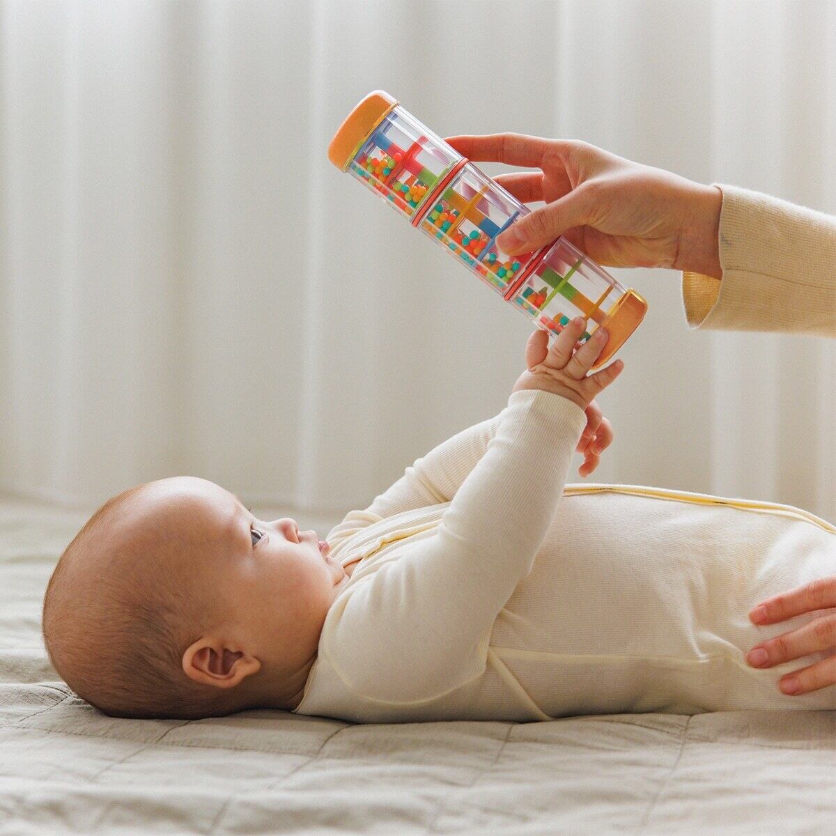 音やビーズの動きをみるだけではなく、ハイハイの頃はころころ転がして、追っかけ遊びでも楽しめます。